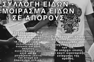 ΠΑΡΑΣΚΕΥΗ 22/5 ΠΛΑΤΕΙΑ ΜΕΡΚΟΥΡΗ-ΑΝΩ ΠΕΤΡΑΛΩΝΑ 18.00-20.00Η ομάδα αλληλεγγύης του κέντρου θα βρίσκεται με πάγκο στην πλατεία Μερκουρη ώστε να συλλέξει είδη πρώτης ανάγκης για άπορους ενώ παράλληλα οποιος έχει ανάγκη μπορεί να πάρει εκείνη την στιγμή. Στο πάγκο μας επισης θα βρείτε μπλουζάκια οικονομικής ενίσχυσης σε χρώματα μαύρο και άσπρο στη τιμή των 10€.Θα υπάρχει επισης και κουτί οικονομικης ενίσχυσης. ΑΥΤΟΟΡΓΑΝΩΣΗ ΚΑΙ ΑΛΛΗΛΕΓΓΥΗ