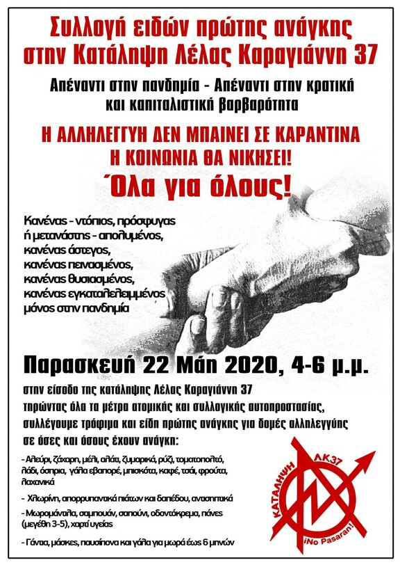 Συλλογή ειδών πρώτης ανάγκηςστην Κατάληψη Λέλας Καραγιάννη 37 Απέναντι στην πανδημία - Απέναντι στην κρατικήκαι καπιταλιστική βαρβαρότητα