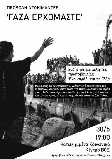 Με αφορμή τη συμπλήρωση δέκα χρόνων από αυτή την επίθεση, χωρίς να θεωρούμε ότι το Παλαιστινιακό ζήτημα έχει λήξει για εμάς, αποφασίσαμε την πραγματοποίηση προβολής-συζήτησης με μέλη της Πρωτοβουλίας "Ένα καράβι για τη Γάζα". Ο μακρύς αγώνας των Παλαιστινίων ενάντια στον Ιμπεριαλισμό και τον Σιωνισμό, αποτελεί παράδειγμα και έμπνευση για τους απανταχού καταπιεσμένους.