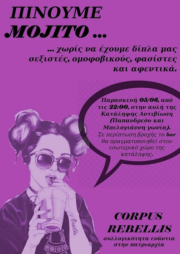 Την Παρασκευή 05/06, από τις 22:00, πίνουμε mojito χωρίς να έχουμε δίπλα μας σεξιστές, ομοφοβικούς, φασίστες και αφεντικά.