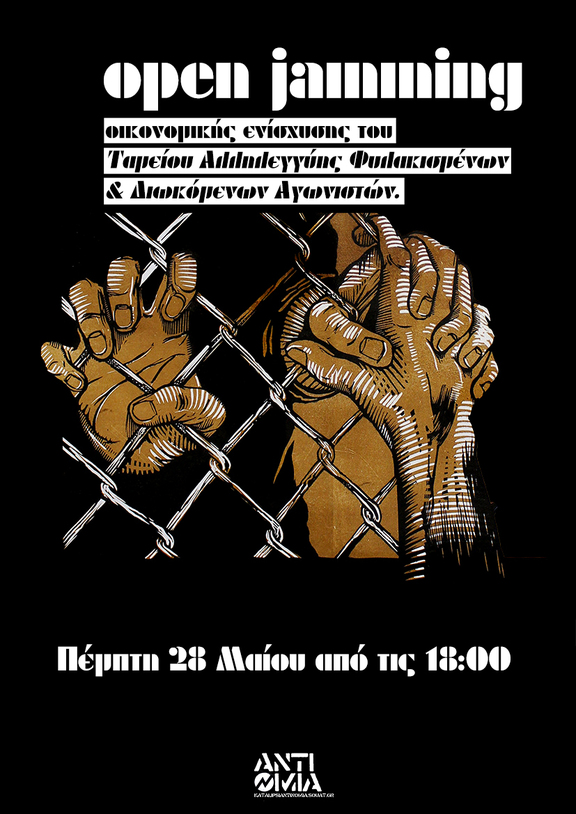 Την Πέμπτη 28 Μαίου από τις 18:00 και μετά θα πραγματοποιηθεί στην κατάληψη Αντινομία Ανοιχτό Tζάμινγκ για την οικονομική ενίσχυση του Ταμείου Αλλλεγγύης Φυλακισμένων και Διωκόμενων Αγωνιστών.