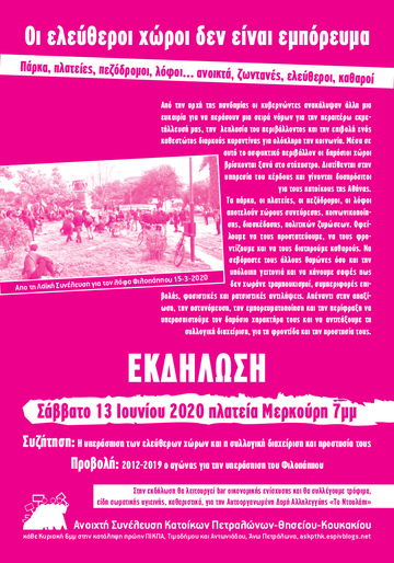 Από την αρχή της πανδημίας οι κυβερνώντες ανακάλυψαν άλλη μια ευκαιρία για να περάσουν μια σειρά νόμων για την περαιτέρω εκμετάλλευσή μας, την λεηλασία του περιβάλλοντος και την επιβολή ενός καθεστώτος διαρκούς καραντίνας για ολόκληρη την κοινωνία. Μέσα σε αυτό το ασφυκτικό περιβάλλον οι δημόσιοι χώροι βρίσκονται ξανά στο στόχαστρο. Διατίθενται στην υπηρεσία του κέρδους και γίνονται δυσπρόσιτοι για τους κατοίκους της Αθήνας.