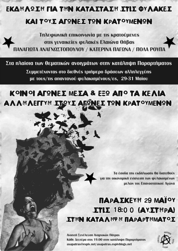 Την Παρασκευή 29/5, στις 18:00(αυστηρά) θα πραγματοποιηθεί στα πλαίσια των θεματικών ανοιγμάτων της κατάληψης Παραρτήματος από τη συνέλευση, εκδήλωση αλληλεγγύης και αντιπληροφόρησης στους αγώνες εντός των φυλακών, με τηλεφωνική επικοινωνία με τις κρατούμενες στις γυναικείες φυλακές Ελαιώνα Θήβας, Παναγιώτα Αναγνωστοπούλου, Κατερίνα Παγώνα και Πόλα Ρούπα.