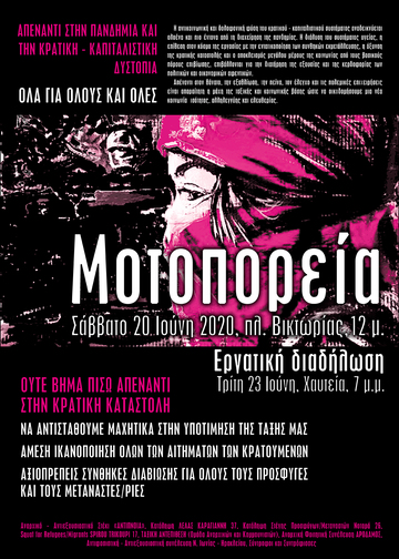 ΣΥΓΚΕΝΤΡΩΣΗ - ΜΟΤΟΠΟΡΕΙΑ ενάντια στην κρατική καταστολή και αλληλεγγύης στουςών αγώνες των εργαζομένων των ανέργων, των κρατουμένων, των προσφύγων και των μεταναστών/τριών,Σάββατο 20 Ιούνη, πλ. Βικτωρίας, 12 μ.