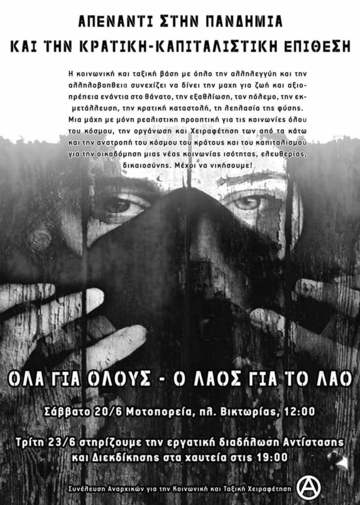 «Η αντικοινωνική και δολοφονική φύση του κρατικού - καπιταλιστικού συστήματος αναδεικνύεται ολοένα και πιο έντονα από τη διαχείριση της πανδημίας. Η διάλυση του συστήματος υγείας, η επίθεση στον κόσμο της εργασίας με την εντατικοποίηση των συνθηκών εκμετάλλευσης, η όξυνση της κρατικής καταστολής και ο αποκλεισμός μεγάλου μέρους της κοινωνίας από τους βασικούς πόρους επιβίωσης, επιβάλλονται για την διατήρηση της εξουσίας και της κερδοφορίας των πολιτικών και οικονομικών αφεντικών.