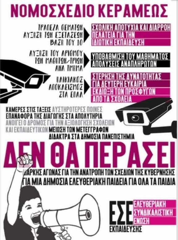 Απέναντι σ' αυτή την νέα κυβερνητική επίθεση στα μορφωτικά δικαιώματα των παιδιών και των νέων και τα εργασιακά δικαιώματα των εκπαιδευτικών που έρχεται να υλοποιήσει τις επιταγές της Ε.Ε. και του ΟΟΣΑ και ενώ την ίδια στιγμή έχουμε να αντιμετωπίσουμε την τροπολογία και την υπουργική απόφαση για την σύγχρονη εξ αποστάσεως και τις κάμερες αλλά και το άνοιγμα των σχολείων χωρίς την εξασφάλιση των αναγκαίων όρων και προϋποθέσεων για την προστασία της υγείας μαθητών και εκπαιδευτικών, το εκπαιδευτικών κίνημα οργανώνει την δική του απάντηση. Μετά από 7 κινητοποιήσεις και μαζικά συλλαλητήρια στη Θεσσαλονίκη κι όλη τη χώρα το τελευταίο δίμηνο, τώρα κάνουμε ακόμη πιο δυναμική τη δράση μας με ένα σύνθημα να ενώνει εκπαιδευτικούς, φοιτητές, γονείς κι όλη την κοινωνία: Το αντιεκπαιδευτικό νομοσχέδιο-έκτρωμα της Κεραμέως ΔΕΝ ΘΑ ΠΕΡΑΣΕΙ!