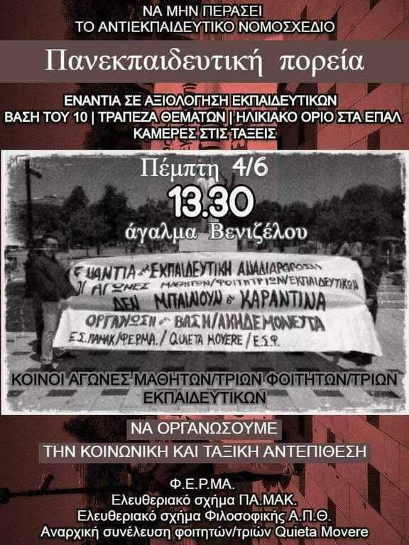 Πανεκπαιδευτικός ξεσηκωμός ενάντια στην κατάθεση και την ψήφιση του αντιδραστικού αντιεκπαιδευτικού νομοσχεδίου - Δευτέρα 1 Ιουνίου, 7μ.μ., άγαλμα Βενιζέλου - ΠΡΟΓΡΑΜΜΑ ΔΡΑΣΗΣ