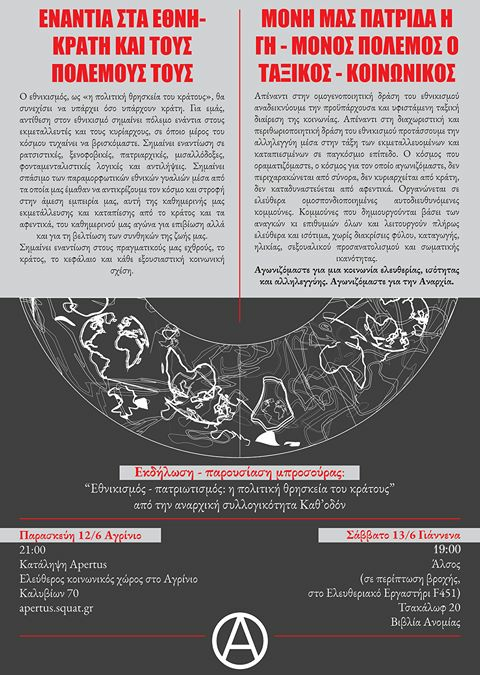 Εκδήλωση - παρουσίαση μπροσούρας: «Εθνικισμός - πατριωτισμός: η πολιτική θρησκεία του κράτους» από την αναρχική συλλογικότητα Καθ' οδόν