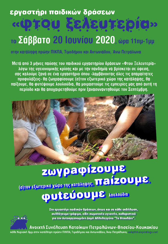 Εργαστήρι παιδικών δράσεων «Φτου Ξελευτερία» το Σάββατο 20 Ιουνίου 2020, ώρα 11πµ-1µµ, στην κατάληψη πρώην ΠΙΚΠΑ, Τιµοδήµου και Αντωνιάδου, Άνω Πετράλωνα.