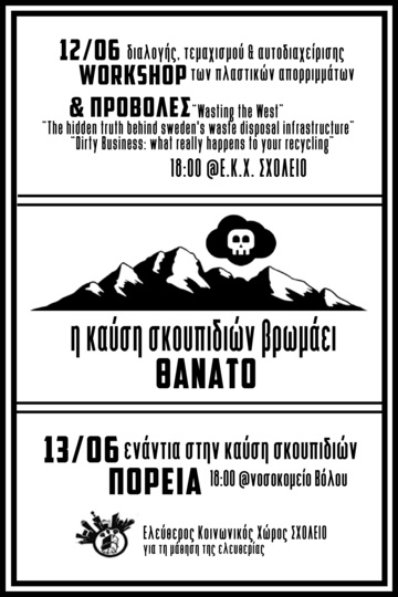 Ενόψει της πορείας προς το εργοστάσιο της ΑΓΕΤ στο Βόλο στις 13/06, θα γίνει workshop της πρώτης φάσης (διαλογής και τεμαχισμού) αυτοδιαχείρησης των πλαστικών απορριμάτων του εκχ σχολείου, από την ομάδα διαχείρισης πλαστικών από τα κάτω, καθώς επίσης και προβολές ντοκιμαντέρ Back to back , σχετικά με την καύση των σκουπιδιών στις 21:00 στην αυλή του Σχολείου.