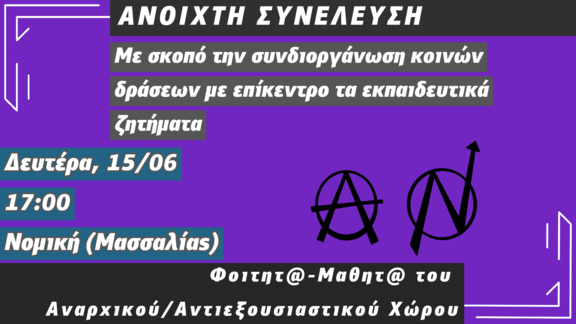 Καλούμε σε νέα ανοιχτή συνέλευση καθε μαθητ@, φοιτητ@, και εκπαιδευτικ@, με σκοπό την συνδιοργάνωση κοινών δράσεων με επίκεντρο τα εκπαιδευτικά ζητήματα.