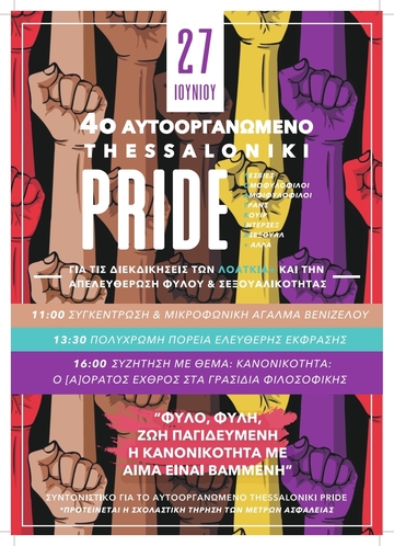 Το Αυτόοργανωμένο Thessaloniki Pride είναι ένα εγχείρημα που δεν στοχεύει απλώς στο να είναι ένα πιο ριζοσπαστικό και αδιαμεσολάβητο αντίπαλο δέος του θεσμικού Thessaloniki Pride. Ειδικά όσο περνάνε τα χρόνια γίνεται ξεκάθαρο ότι αντιλαμβανόμαστε το πρόταγμα της αυτο-οργάνωσης ως μία συνολικότερη κοινωνική πρακτική, πέρα από τον τρόπο διοργάνωσης του Pride. Δρούμε μέσα από ανοιχτές συνελεύσεις όπου έχουμε όλ@ ίσο λόγο για ό,τι κάνουμε και προσπαθούμε να μην αναπαράγουμε ιεραρχικά μοντέλα ή εθιμικούς κανόνες αλλά να βρίσκουμε κάθε φορά το σημείο τομής των απόψεών μας. Για μας το Pride ήτανε μία εξέγερση ενάντια στην καταπίεση των ΛΟΑΤΚΙ+ ατόμων, η σπίθα των αγώνων για να ζούμε ελεύθερα, και δεν ανεχόμαστε την εμπορευματοποίησή του. Παράλληλα, αναγνωρίζουμε ότι υπάρχουν πολλαπλές καταπιέσεις και πολλές φορές αλληλοδιαπλέκονται αλλά και ότι υπάρχουν ταυτότητες πιο αόρατες από άλλες. Το αυτοοργανωμένο pride δεν είναι μόνο μία συμβολή στη μάχη για τη ΛΟΑΤΚΙΑ+ απελευθέρωση αλλά και ένας χώρος έκφρασης λόγου και οργάνωσης πράξεων κόντρα σε κάθε μορφή καταπίεσης. Ενάντια στο φασισμό, το ρατσισμό, την πατριαρχία, τους ταξικούς διαχωρισμούς. Ξέρουμε ότι καθένα από μας έχει διαφορετικά βιώματα και με κατανόηση και σεβασμό επιδιώκουμε να σπάμε ακόμα και μέσα μας κατάλοιπα προβληματικών ή και εξουσιαστικών συμπεριφορών. Συνήθως απλώνουμε εκδηλώσεις και workshop στο χρόνο μίας βδομάδας, πριν την πορεία του Pride. Φέτος, λόγω της συγκυρίας με τον ιό, που έφερε μεταξύ άλλων και δυσκολίες στη μεταξύ μας επαφή, αποφασίσαμε να καλέσουμε μόνο την πορεία και μία εκδήλωση μετά από αυτήν. Ακόμα και σε συνθήκες πανδημίας, είμαστε εδώ για να δείχνουμε αλληλεγγύη και φροντίδα το ένα στο άλλο. Θα κάνουμε προσπάθεια επίσης να τηρήσουμε τα μέτρα ασφαλείας και να κάνουμε το φετινό Αυτοοργανωμένο Pride όσο το δυνατόν πιο ασφαλές και συμπεριληπτικό. Η κατάσταση που διανύουμε είναι πολύ κρίσιμη και το να κατεβούμε στο δρόμο είναι αναγκαιότητα.