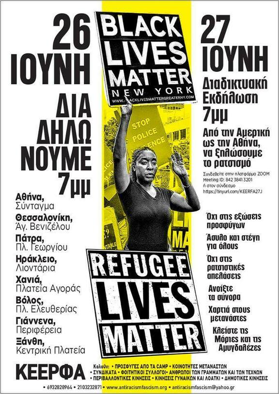 Σας καλούμε να οργανώσουμε μαζί με τους πρόσφυγες από τα καμπ και τις κοινότητες μεταναστών ένα Διήμερο δράσης ενάντια στο ρατσισμό, στις 26 και 27 Ιούνη. Να πιάσουμε το νήμα των διεθνών κινητοποιήσεων που στις 21 Μάρτη αντιμετώπισαν τις απαγορεύσεις λόγω της πανδημίας αλλά τώρα ξεχειλίζουν σε όλο το πλανήτη.