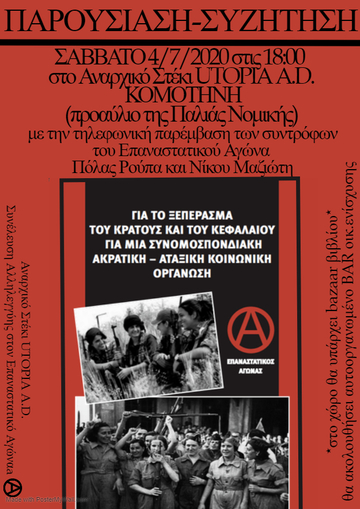 Παρουσίαση- Συζήτηση Σάββατο 04/07/2020 ώρα 18:00 στο Αναρχικό Στέκι UTOPIA A.D. (προαύλιο παλιάς νομικής) με την τηλεφωνική παρέμβαση των συντρόφων του ΕΠΑΝΑΣΤΑΤΙΚΟΥ ΑΓΩΝΑ Πόλας Ρούπα και Νίκου Μαζιώτη και εισηγήσεις από το Αναρχικό Στέκι UTOPIA A.D και την Συνέλευση Αλληλεγγύης στον Επαναστατικό Αγώνα .