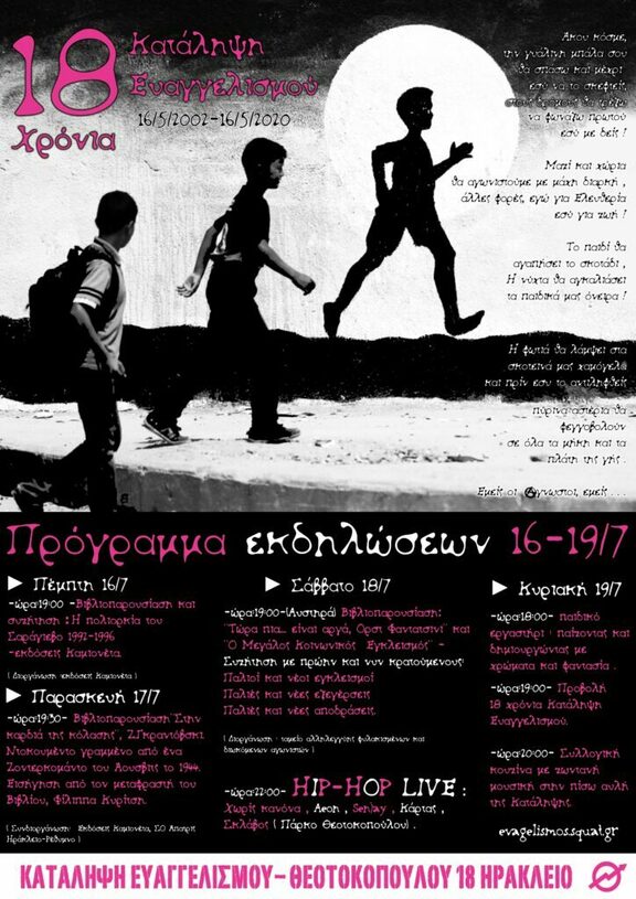 18 χρόνια Κατάληψη Ευαγγελισμού | Πρόγραμμα εκδηλώσεων 16-18 Ιουλίου 2020(*όλες οι εκδηλώσεις της Κυριακής ακυρώνονται)