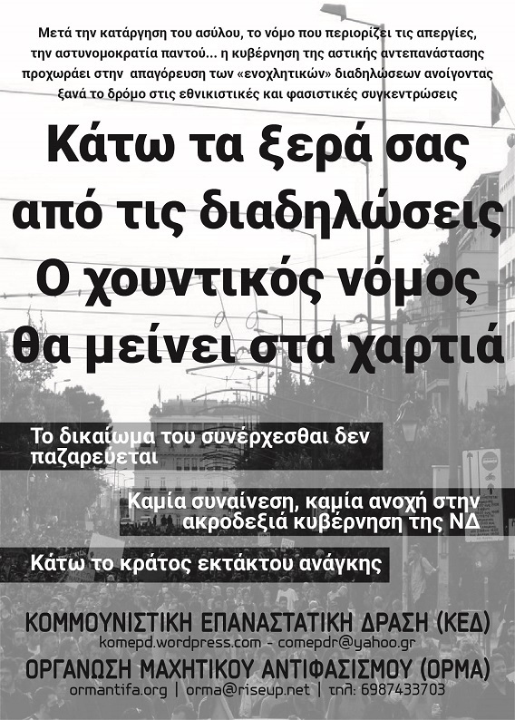 Η κυβέρνηση της ΝΔ ασκώντας την ακροδεξιά πολιτική της επιτίθεται στα δικαιώματα και τις ελευθερίες μας με το νέο αντιδημοκρατικό νόμο απαγόρευσης των διαδηλώσεων. Έχοντας ήδη περάσει νόμους κατάργησης του ασύλου και περιορισμού των απεργιών, ενώ επιβάλλει την αστυνομοκρατία για κάθε μέτρο αντιμεταναστευτικό, αντεργατικό, αντιπεριβαλλοντικό μέτρο που περνάει, τώρα επιδίδεται σε αντικομμουνισμό και ανοίγει ξανα το δρόμο σε εθνικιστικές και φασιστικές συγκεντρώσεις. Πρόκειται για μια ολομέτωπη επίθεση προς τις οργανώσεις των εργατών, παράλληλα εκφοβισμό των αγωνιστών και της νεολαίας. Η ΝΔ προσπαθεί να χτίσει Κράτος Έκτακτης Ανάγκης χωρίς αντιστάσεις συνεχίζοντας το "δόγμα σοκ", το ταξικό εργατικό κίνημα πρέπει να δείξει μηδενική ανοχή και υποχώρηση.