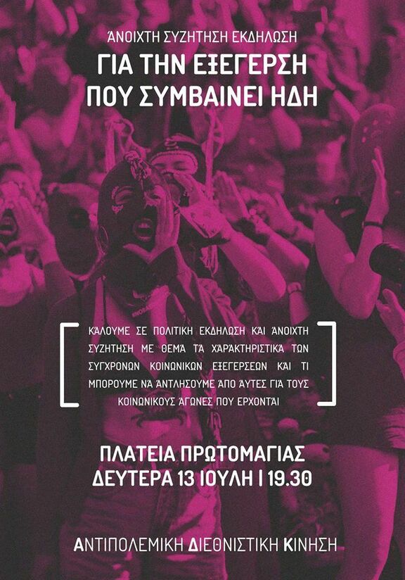 Τη Δευτέρα 13 Ιούλη καλούμε σε πολιτική εκδήλωση και ανοιχτή συζήτηση με θέμα τα χαρακτηριστικά των σύγχρονων κοινωνικών εξεγέρσεων και τί μπορούμε να αντλήσουμε από αυτές για τους κοινωνικούς αγώνες που έρχονται