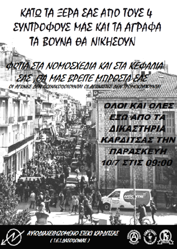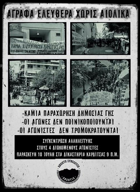 Ανακοίνωση της Αναρχικής Πολιτικής Οργάνωσης για τις διώξεις 4 αγωνιστών που δικάζονται στις 10 Ιούλη για τη συμμετοχή τους στον αγώνα υπεράσπισης των Αγράφων.