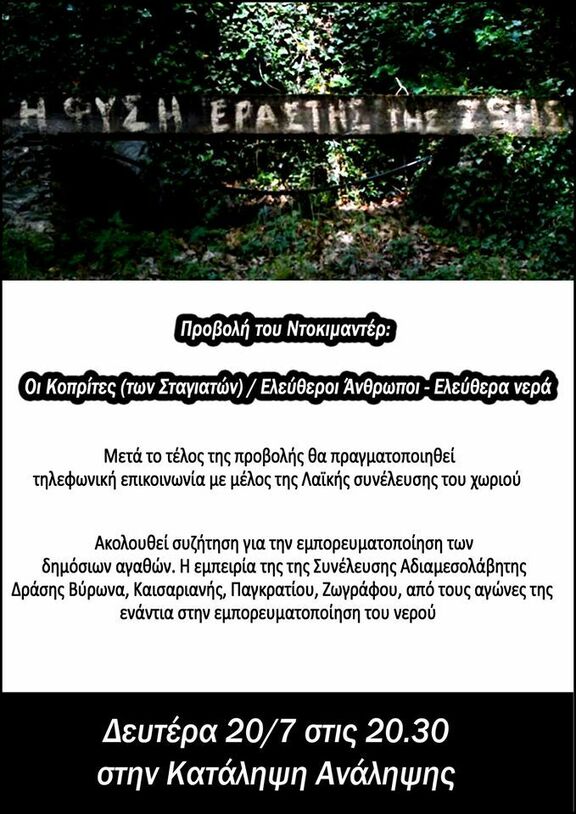Προβολή ντοκιμαντέρ: Οι κοπρίτες (των Σταγιατών)/ Ελεύθεροι Άνθρωποι - Ελεύθερα νερά