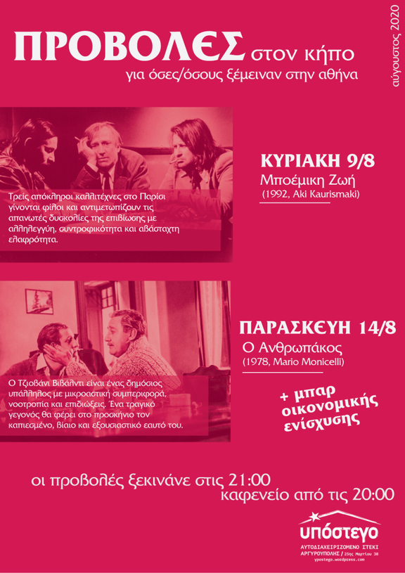 Το τελευταίο διάστημα, εν μέσω μιας συνθήκης που απαιτεί την αποξένωση και την εξατομίκευση προσπαθούμε να δημιουργήσουμε ένα σημείο στις γειτονιές μας που σε σταθερή βάση μπορούμε να συναντηθούμε, να συζητήσουμε , να δούμε ταινίες, να ακούσουμε μουσική, να πιούμε μπύρες. Χωρίς εισιτήριο, χωρίς τραπεζοκαθίσματα να καταπατούν πεζοδρόμια και πλατείες, μακριά από τις εκμεταλλευτικές σχέσεις των μαγαζιών. Από εμάς για εμάς.