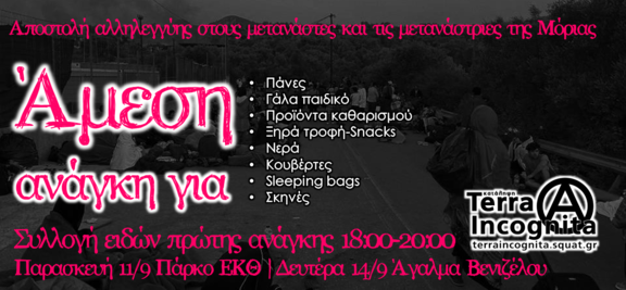 Το βράδυ της Τρίτης 8 Σεπτέμβρη μια μεγάλη πυρκαγιά ξέσπασε στο κέντρο κράτησης μεταναστών της Μόρια και ένα μεγάλο μέρος του κάηκε ολοσχερώς. 13.000 χιλιάδες εγκλωβισμένοι είναι από σήμερα και άστεγοι, ενώ οι ζωές τους μπήκαν σε μεγάλο κίνδυνο (ευτυχώς δεν έχει βρεθεί ακόμα νεκρός). Με το ξέσπασμα της φωτιάς, οι άνθρωποι αυτοί βρίσκονται στους γύρω δρόμους, με την αστυνομία να τους εμποδίζει να πλησιάσουν τη Μυτιλήνη. Το έργο της αστυνομίας σπεύδει να βοηθήσει και μερίδα πολιτών, που "παίρνει το νόμο στο χέρια της". Το Υπουργείο Πολιτικής Προστασίας κήρυξε το νησί σε κατάσταση έκτακτης ανάγκης, που σημαίνει στρατιωτική διαχείριση και καταστολή ενάντια στους/ις μετανάστες/ριες. Η μόνη έκτακτη ανάγκη για εμάς, πριν και μετά τη φωτιά, είναι οι ανάγκες των ανθρώπων που μένουν στα κολαστήρια-κέντρα κράτησης και η επιθυμία τους να ζήσουν ελεύθεροι, μέσα στον αστικό ιστό.