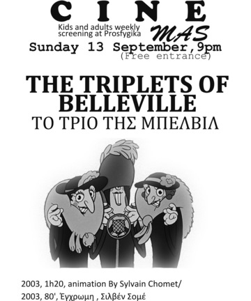 Χωρίς σχεδόν καθόλου διάλογο η πρώτη ταινία που θα προβληθεί, χρησιμοποιεί τη σύγχρονη τεχνολογία και τις καλύτερες τεχνικές animation για να δημιουργήσει κάτι ευφυές και ξεκαρδιστικό. Αστεία και ανέμελη αλλά ταυτόχρονα σκοτεινή και μυστηριώδης. Το Τρίο της Μπελβίλ [Les Triplettes De Belleville] του Σιλβέν Σομέ [2003, 80', Έγχρωμη] είναι ένα σκανταλιάρικο μελανόμορφο δημιούργημα μιας περιπετειώδους ποδηλατάδας. Ο Champion ενώ ετοιμάζεται να συμμετάσχει στο Tour de France, απαγάγεται κι εκεί ξεκινά ένα διαφορετικο συναρπαστικό ταξίδι.