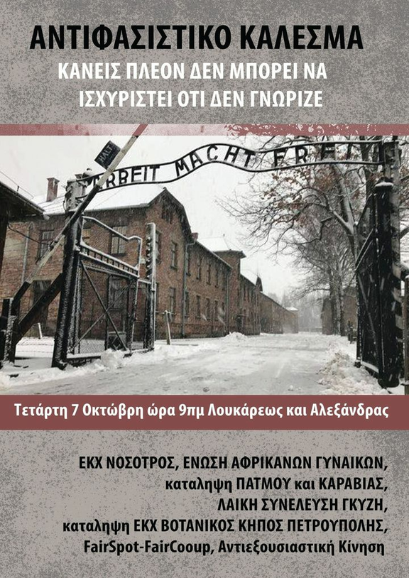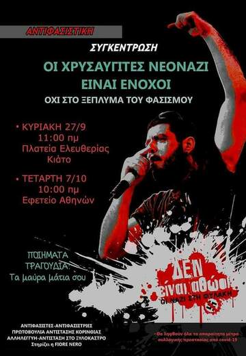 NOT A SPITHAME OF LAND TO THE FASCISTS Antifascist gathering Wednesday, October 07, 9:00 Athens Court of Appeal On October 7 in Athens, after 5,5 years of judicial procedure, the decision of the Golden Dawn trial is announced. The criminal organization of Michaloliakos, Kasidiaris and their group, responsible for the murders of Pavlos Fyssa, Sahzat Lukman, attacks on immigrants, anarchists, communists, self-management hangouts and squats, will be faced with perhaps the largest gathering of antifascists / three in the newest history. We should not be illusions though, the fight against fascism will not end in courtroom. We should not reassure ourselves, whatever the court order is. As Duruti said: ′′ No government fights fascism to destroy it. When the urban class sees that power slips out of its hands, it recalls it to preserve privileges ". Chrysi Dawn entered the parliament in 2011, when the movement against memorandum policies was upside down. The media and deputies of various parties of the ′′ democratic arc ′′ commented positively, referring to a ′′ fresh, authentic, national movement ′′ that could express the ′′ damaged Greek people ". While more and more people questioned the neoliberal EU policies, bankers and bureaucrats, Golden Dawn was the movement that came and said ′′ not to think about all this ", to ′′ bend our heads ′′ because ′′ illegal immigrants are the ones we should blame for the Unemployment ". As history has shown us before, fascism is the last paper of the system's strong to manage to hold their position. Shifting the wrath of the world from oppressors to the oppressed as the rich and strong continue to enjoy their privileges. All this until the murder of Pavlos Fyssa. From then on, when the world woke up from the lethargy that had caught him, the ′′ above ′′ found a chance to show their ′′ democratic ′′ profile by condemning Michaloliakos's neo-Nazis forgetting that they were the ones who gave them power. The exact same thing they're trying to do now. Under the seemingly ′′ anti-fascist / democratic unity ′′ that the media are trying to sell us, various parties, politicians, companies and lifestyle - persons, we must remember that like fascism does not end with a trial so is not just the Golden Dawn hatching the snake egg. Fascism is the only political ideology whose followers avoid calling. They use various euphemisms such as ′′ patriots ", ′′ frustrated citizens ′′ or ′′ nationalists ". And because Golden Dawn has identified so much with fascism in recent years, many times it seems enough to condemn her actions to be considered a ′′ democrat ". In fact, however, things we considered unthinkable a seven years ago have become a gloomy reality in 2020: Closed - supervised immigrant concentration camps in the islands and everywhere, matte, aura, tear gas to address immigrant / three claims, intolerant rhetoric by regional governors - mayors - local lords, violation of international coast guard conditions and illegal repromotions, normalization of racist incidents, criminalization any solidarity initiative Mr. Etc. Let Wednesday morning be a new start of a multifaceted struggle of the bottom against the whole world cannibals, for a society free, equality and solidarity Gathering camps-PUSHBACKS AND GROWLS FASCISM IS NOT ONLY THE GOLD Dawn Antifascist gathering Wednesday, October 07, 9:00 Athens Court of Appeal