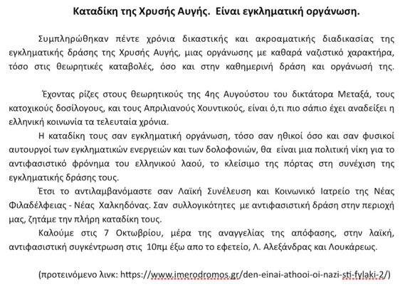 Στις 18 Σεπτέμβρη και στις 7 Οκτώβρη στέλνουμε ένα δυνατό και καθαρό μήνυμα. Οι ναζι στη φυλακή. Η φωνή μας πρέπει να φτάσει έως την έδρα του δικαστηρίου για να καταλάβουν καλά, ότι ακόμη και αν τώρα νιώθουν ασφαλείς από την εξουσία, που κατέχουν, αν αποφασίσουν να οπλίσουν ξανά το χέρι του φασίστα, η Ιστορία θα σταθεί αμείλικτη μαζί τους. Σε μια περίοδο που η Άκρα Δεξιά και ο φασισμός κερδίζουν έδαφος σε Ευρώπη και Αμερική, εμείς, οι χιλιάδες, που τόσα χρόνια στεκόμαστε απέναντι στο σκοτάδι και το πολεμάμε, φωνάζουμε δυνατά. Θέλουμε να ζήσουμε σε μια κοινωνία ελεύθερη, όπου κάθε ζωή είναι ιερή και οι άνθρωποι είναι ίσοι ανεξάρτητα από το χρώμα που έχει το δέρμα τους, από την καταγωγή τους ή την σεξουαλική τους προτίμηση. Είμαστε όλοι και όλες διαφορετικοί είμαστε όλοι και όλες ίσοι και θέλουμε να περπατάμε με ασφάλεια στον δρόμο χωρίς τον φόβο του ρατσιστή και του φασίστα.