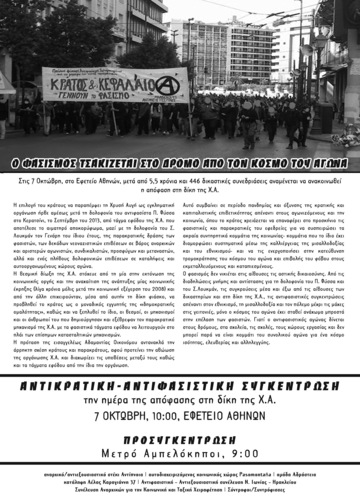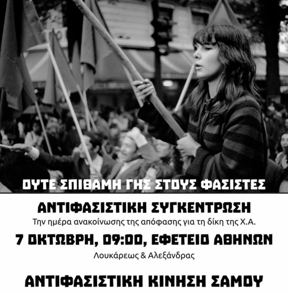 Στις 7 Οκτώβρη στην Αθήνα, μετά από 5,5 χρόνια δικαστικής διαδικασίας, ανακοινώνεται η απόφαση της δίκης της Χρυσής Αυγής. Η εγκληματική οργάνωση του Μιχαλολιάκου, του Κασιδιάρη και της γκρούπας τους, που είναι υπεύθυνη για τις δολοφονίες του Παύλου Φύσσα, του Σαχζάτ Λουκμάν, τις επιθέσεις σε μετανάστες/τριες, αναρχικούς/ές, κομμουνιστές/τριες, αυτοδιαχειριζόμενα στέκια και καταλήψεις, θα βρεθεί αντιμέτωπη με ίσως την μεγαλύτερη συγκέντρωση αντιφασιστών/τριών στην νεότερη ιστορία. Δεν θα πρέπει να έχουμε ψευδαισθήσεις όμως, ο αγώνας ενάντια στον φασισμό δεν θα τελειώσει στις δικαστικές αίθουσες. Δεν θα πρέπει να καθησυχαζόμαστε, όποια και αν είναι η απόφαση του δικαστηρίου. Όπως είχε πει και ο Ντουρούτι: "Καμιά κυβέρνηση δεν πολεμάει τον φασισμό για να τον καταστρέψει. Όταν η αστική τάξη βλέπει ότι η εξουσία γλιστράει από τα χέρια της, τον ανακαλεί για να διατηρήσει τα προνόμια".