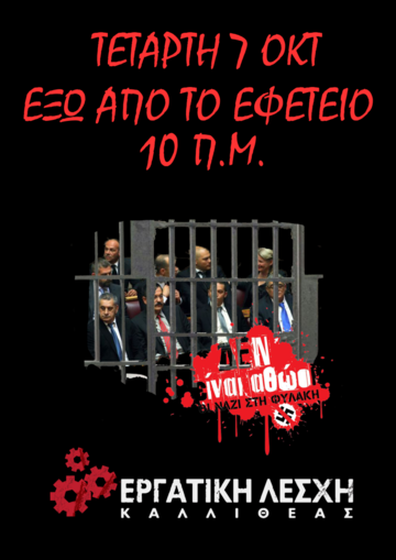 Όλοι και όλες, αύριο Τετάρτη 7 Οκτωβρίου, στις 10 πμ., έξω από το Εφετείο (Αλεξάνδρας και Λουκάρεως). Να καταδικαστεί η εγκληματική δολοφονική ναζιστική οργάνωση της Χρυσής Αυγής! Να μην πέσουν στα μαλακά! Η μόνη λαϊκή ετυμηγορία είναι: ΟΛΟΙ ένοχοι, ΟΛΟΙ ΙΣΟΒΙΑ!