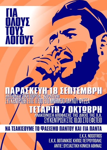 Στις 18 Σεπτεμβρη συμπληρώνονται 7 χρόνια από εκείνη τη νύχτα, που ο αντιφασίστας μουσικός Παύλος Φύσσας έπεσε νεκρός στο Κερατσίνι από το ναζιστικό τάγμα εφόδου της Χρυσής Αυγής. Στις 7 Οκτώβρη ολοκληρώνεται η δίκη της ναζιστικής οργάνωσης με την ανακοίνωση της απόφασης στο Εφετείο Αθηνών. Εδώ και λίγες μέρες ένα πρωτόγνωρο κίνημα έχει κάνει την εμφάνιση του ζητώντας την καταδίκη της ΧΑ, της ηγεσίας της και του αρχηγού της Νίκου Μιχαλολιάκου. Ψηφίσματα συμπαράστασης στην οικογένεια του Παύλου και ανακοινώσεις συμμετοχής στις αντιφασιστικές συγκεντρώσεις στο Κερατσίνι στις 18 Σεπτέμβρη που θα πραγματοποιηθεί πορεία στην μνήμη του Παύλου και σε αντίστοιχα καλέσματα σε δεκάδες πόλεις της Ελλάδας και στο Εφετείο στις 7 Οκτώβρη βλέπουν καθημερινά το φως της δημοσιότητας, ψηφίσματα από σωματεία εργαζομένων(3ωρη στάση εργασίας από την ΑΔΕΔΥ,απεργία από δεκάδες πρωτοβάθμια σωματεία, ΕΛΜΕ) πολιτικές οργανώσεις, φοιτητικούς συλλόγους, κινήσεις πολιτών, πλήθος συλλογικών φορέων.