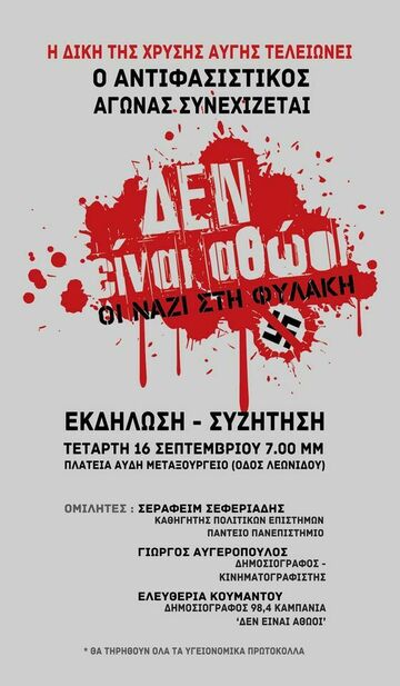 Η καμπάνια ΔΕΝ ΕΙΝΑΙ ΑΘΩΟΙ συνεχίζοντας τις δράσεις της,διοργανώνει πολιτική εκδήλωση 16 Σεπτεμβρίου 19.00 στην Πλατεία Αυδή στο Μεταξουργείο για να συζητήσει για τη δίκη,να διατρανώσει την απαίτηση της κοινωνίας για συνολική καταδίκη της εγκληματικής ναζιστικής οργάνωσης αλλά και να θέσει στο τραπέζι του δημοσίου διαλόγου την ανάγκη συνέχισης του αντιφασιστικού αγώνα παντού.