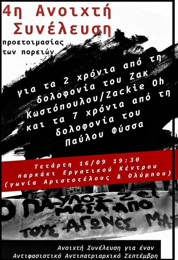 Στην 4η ανοιχτή μας συνέλευση, θα συζητήσουμε διεξοδικά για τα μέτρα ασφαλείας για την πανδημία κατά τη διάρκεια των πορειών και της εκδήλωσης και θα ολοκληρώσουμε την προετοιμασία αυτών των δράσεων για τον Παύλο Φύσσα και τον Ζακ Κωστόπουλο/Zackie Oh.