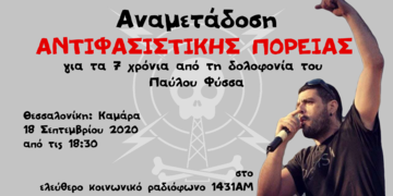 Στηρίζουμε και αναμεταδίδουμε την αντιφασιστική πορεία για τα 7 χρόνια από τη δολοφονία του Παύλου Φύσσα, που καλείται την Παρασκευή 18 Σεπτεμβρίου στις 18:30 στην Καμάρα Θεσσαλονίκης.