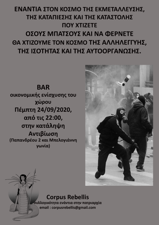 Την Πέμπτη 24 Σεπτεμβρίου από τις 22:00, μπαρ οικονομικής ενίσχυσης της κατάληψης Αντιβίωση στο χώρο της κατάληψης.