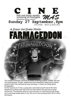 [ENG] This Sunday, Prosfygika continues its weekly screening program, CineMas. We host the young audience, friends, neighborhood and Ampelokipi's inhabitants to gather around a silent film rhythmed by music and songs: A Shaun the Sheep Movie: Farmageddon. In this inventive sci-fi tale, a young alien crash lands on earth and all the farm animals led by Shawn must help to get her back before the usual secret group catches her. The animation movie is a joy from start to finish and you soon forget you're watching models made of clay. Join us for this screening that's full of charm and humour.