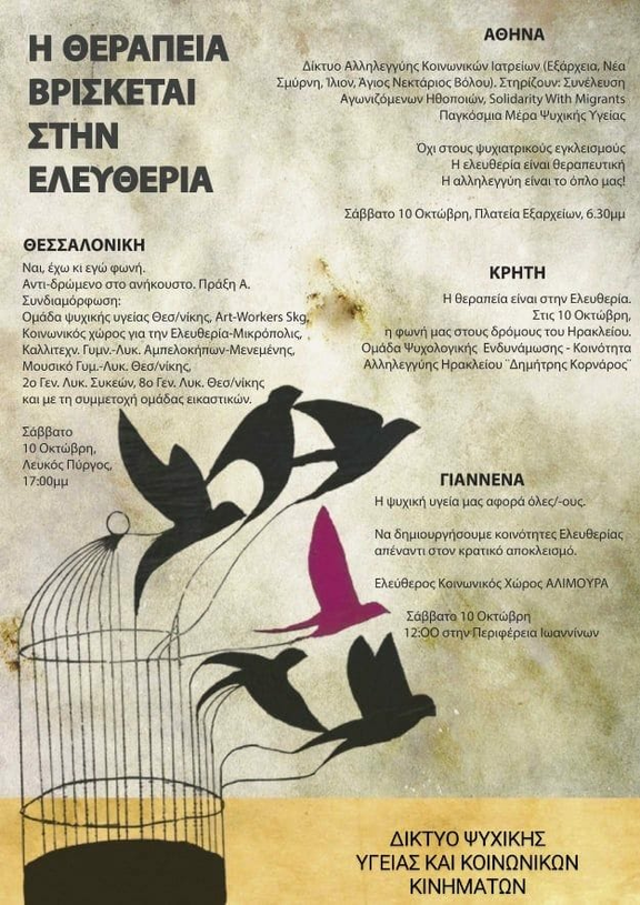 On the occasion of the world Mental Health Day on October 10, the word of those who are excluded in public space through the voice of social movements as a call for collective resistance and solidarity. Mobilizations take place following the two-day ′′ Mental Health & Social Movements: experiences and reflection from, after and beyond the generalized imprisonment ′′ and the nationwide meetings that followed with the participating collections - which are the ′′ Mental Health & Social Movements ′′ Network. where, on the occasion of the world mental health day at 10/10, our presence in the public area was codecision with parallel actions in Thessaloniki, Athens, Crete and Giannena. THERAPY IS IN FREEDOM Network ′′ Mental Health & Social Movements ′′
