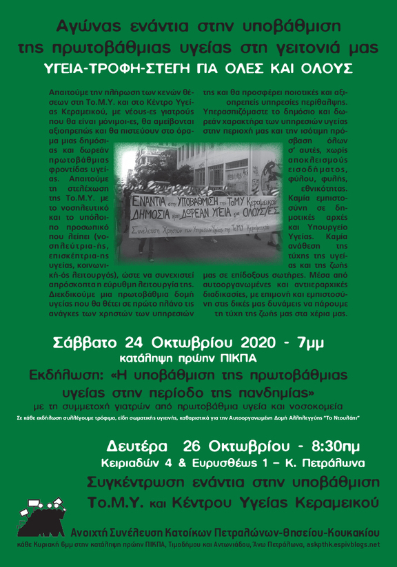 Συγκέντρωση ενάντια στην υποβάθμιση της To.M.Y. και του Κέντρου Υγείας Κεραμεικού / Δευτέρα 26 Οκτωβρίου 2020 - 8:30πμ (Κειριαδών 4 & Ευρυσθέως 1 - Κ. Πετράλωνα)