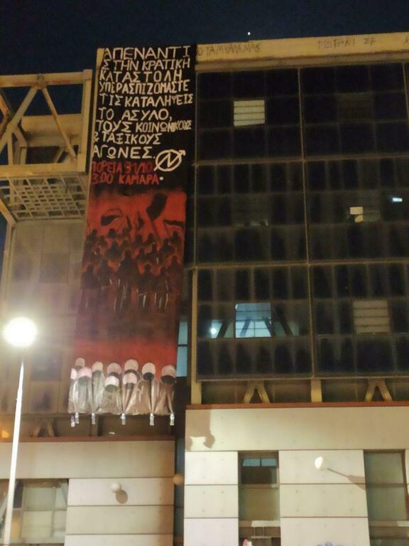"Σήμερα το πρωί δεκάδες συντρόφισσες και σύντροφοι προχωρήσαμε στην συμβολική κατάληψη της σχολής Θεάτρου του ΑΠΘ για να δημιουργήσουμε τη στέγη οργάνωσης μια μέρας αφιερωμένης στον αγώνα για την υπεράσπιση και την αλληλεγγύη στις καταλήψεις που βρίσκονται στο στόχαστρο της κατασταλτικής πολιτικής του κράτους το τελευταίο διάστημα.