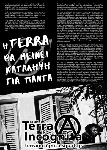 Για πάνω από 16 χρόνια η κατάληψη Terra Incognita, έχει αποτελέσει σημείο συνάντησης και τριβής εκατοντάδων αγωνιστριών και αγωνιστών της μαχόμενης κοινωνικής βάσης. Με συνεχείς εκδηλώσεις, παρεμβάσεις, διαδηλώσεις και συγκρούσεις βρέθηκε παρούσα σε στιγμές μαχητικού αγώνα ενάντια στη βία του κρατισμού, ενάντια στα συμφέροντα των καπιταλιστικών μονοπωλείων, ενάντια στην παραβιαστική εξουσία του φασισμού και της πατριαρχίας, ενάντια σε κάθε διάκριση και ειδισμό. Μέσα στα εδάφη και τις αυτοοργανωμένες δομές αυτομόρφωσης, αλληλεγγύης και αλληλοβοήθειας της κατάληψης συναντήθηκαν και συναντιούνται ακόμα όλοι οι ¨γνωστοί-Άγνωστοι¨ μαχητές της ελευθερίας. Οικοδομήθηκαν απελευθερωτικές και ανεξούσιες σχέσεις, ανατρεπτικά σχέδια και επιχειρήσεις, όνειρα που μέρα με τη μέρα βρήκαν και βρίσκουν ακόμη και σήμερα ηθική και υλική υπόσταση. Η κατάληψη για πανω από 16 χρόνια αποτελεί σάρκα από τη σάρκα του πολύμορφου αγώνα ενάντια σε κάθε εξουσία και καταπίεση, χωρίς να ιεραρχεί και να διαχωρίζει τα μέσα που συμβάλλουν στην διασπορά των ελευθεριακών προταγμάτων και την οργάνωση της κοινωνικής και ταξικής αντεπίθεσης. Γιατί για μας αυτό είναι απελευθέρωση.