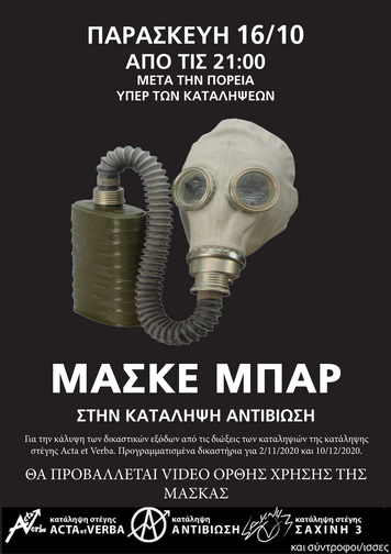 Για την κάλυψη των δικαστικών εξόδων από τις διώξεις των καταληψιών της κατάληψης στέγης Acta et Verba. Προγραμματισμένα δικαστήρια για 2/11/2020 και 10/12/2020.