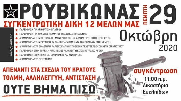 Στις 29/10/2020 μετά από αναβολή από τον Ιούνη του 2018 πραγματοποιείται η πρώτη «συγκεντρωτική» δίκη μελών του Ρουβίκωνα για σειρά παρεμβάσεων της συλλογικότητας. 12 μέλη μας βρίσκονται κατηγορούμενα για υποθέσεις που αφορούν: παρέμβαση για χρηματισμό γιατρού, παρέμβαση για διακοπές ρεύματος της ΔΕΗ σε νοικοκυριά, παρέμβαση στην κατοικία του γερμανού πρέσβη ως αλληλεγγύη στους πρόσφυγες, παρέμβαση στην πρεσβεία Σαουδικής Αραβίας κατά του πόλεμου στην Υεμένη, παρέμβαση στα δικαστήρια Λάρισας για την υπόθεση απελευθέρωσης βιαστή Στρατιωτικού, παρέμβαση στην Turkish Airlines ως αλληλεγγύη στον κουρδικό αγώνα, παρέμβαση στο υπουργείο οικονομίας και ανάπτυξης, παρέμβαση στο πεντάγωνο.