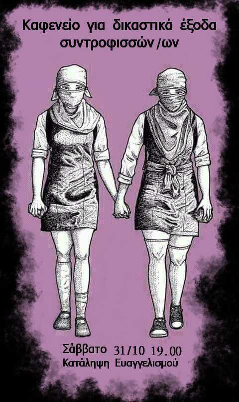 Στις 31/10 θα πραγματοποιηθεί καφενείο οικονομικής ενίσχυσης για δικαστικά έξοδα συντροφισσών και συντρόφων, στην κατάληψη Ευαγγελισμού. Το καφενείο θα διαρκέσει από τις 19.00 ως τις 12.00.