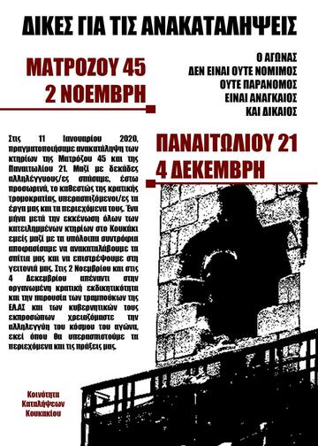 Αλληλεγγύη στους/στις συλληφθέντες/είσες της ανακατάληψης της Ματρόζου 45 και Παναιτωλίου 21 που δικάζονται 2 Νοεμβρίου και 4 Δεκεμβρίου