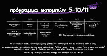 - 21:30 - Οι καταλήψεις ως πρόταγμα αγώνα στο σήμερα (Ηχογραφημένη εκδήλωση από την κατάληψη σχολής Θεάτρου - 29/10/2020)