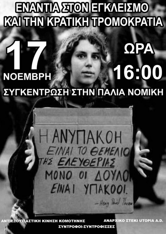 The junta pandemonium in an outbreak Since the beginning of the pandemonium we have all been in an unprecedented situation, with the government taking imprisonment as the first measure, while suppression and propaganda of media has reached a compromise on society in the new conditions. While society was locked up and terrified in its homes, the government's financial dealers with all kinds of trimmer were underway, putting health into second degree. In a time of health crisis, the self-evident thing would be to strengthen the public health system. Instead, the government chooses to strengthen suppression and fear with the ultimate purpose of legitimizing the new imprisonment treaty, achieving its political barbarism undisturbed. This is how the media takes action by reproducing government propaganda, starting a psychological war against the people. Thereby contributing to the psychological collapse of the social ensemble. The government's political goal is to create a society of cops and privatizations. Since the beginning of the pandemonium there has been permanent recruitment in security forces with the ultimate purpose of imposing police democracy to address any radical voice. Combined with suppression and propaganda, the government discloses its responsibilities, using individual responsibility as a tool and creating a climate of panic and terrorism, strengthens social cannibalism in its name. Result of this? Violating basic rights and freedoms, such as curfew especially during the evening, reminiscent of a fascist regime. At the same time marginalized and second sorting people are the invisible of this society to the state mechanism, without respecting the minimum prevention measures, stacking them into closed structures, with what this implies. The only individual responsibility is the one that weighs on the government itself. Since the time of dictatorship we live today the closest version of it if not the same. The reason for the pandemonium was ′′ saving ′′ for the government in order to bleed out social and political struggles. Based on what's going on and the anniversary of the University of Athens rebellion we consider it the right time to take back what we were stolen by not allowing us to humiliate every concept of freedom, reminding us of times of obscurantism and hatred. Take our lives into our own hands and break the juntic press bans. It's our duty and individual responsibility. We invite everyone to a gathering against the state management of the pandemonium on Tuesday, November 17, at Old Law School 4:00 pm. Anarchist hangout Utopia a.d. Anti-government Movement of Komotini Comrades-Comrades