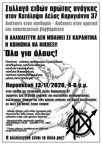 στην είσοδο της κατάληψης Λέλας Καραγιάννη 37 τηρώντας όλα τα μέτρα ατομικής και συλλογικής αυτοπροστασίας, συλλέγουμε τρόφιμα και είδη πρώτης ανάγκης για δομές αλληλεγγύης σε όσες και όσους έχουν ανάγκη: