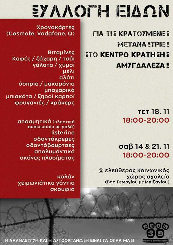 Η Room39 καλεί σε συλλογή ειδών για τις κρατούμενες μετανάστριες στην Αμυγδαλέζα.