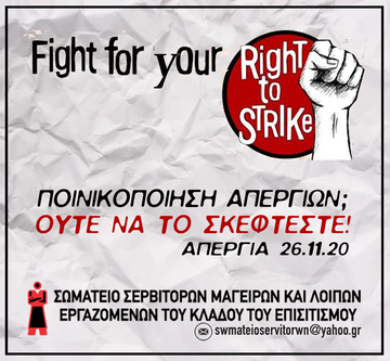 Σαν να μην έφταναν τα παραπάνω, οι απεργίες μας κυρήσσονται παράνομες όταν παρακωλύεται η λειτουργία της επιχείρησης και οι απεργοί διώκονται ποινικά. Η απεργία, το μπλοκάρισμα της παραγωγής και της κυκλοφορίας του κεφαλαίου, ήταν,είναι και θα είναι εργαλεία αγώνα απαραίτητα για τις νικηφόρες μέρες του εργατικού κινήματος. Οι απεργίες δεν γίνονται για να πάρουμε ρεπό, ούτε για να κάνουμε περίπατο στην πόλη είναι το μέσο που θα ακουστούν οι φωνές μας και θα ασκήσουμε πίεση και κόστος στα κέρδη τους, όταν αυτά κερδίζονται εις βάρος των εργαζομένων.