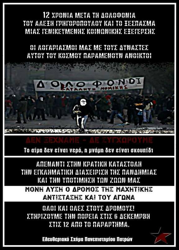 Εμείς από τη μεριά μας, κόντρα στους σχεδιασμούς των κυρίαρχων και το δυστοπικό μέλλον που ετοιμάζουν τόσο για μας, όσο και για τα ευρύτερα κομμάτια της εκμεταλλευόμενης τάξης έχουμε να αντιτάξουμε τη δύναμη που πηγάζει από τη συλλογικοποίηση και τον αγώνα. Μέσα στις συνθήκες της συνολικής κρίσης που βιώνουμε, κόντρα στις κρατικές απαγορεύσεις και την αστυνομική τρομοκρατία, να υπερασπιστούμε τη μνήμη, τους νεκρούς μας και τους αγώνες μας. Να δημιουργήσουμε εστίες αντίστασης και αγώνα εντός και εκτός των πανεπιστημίων. Η 6η Δεκέμβρη δεν αποτελεί για εμάς απλά μια ημέρα μνήμης, αλλα μας υπενθυμίζει τα όσα μπορούμε να πετύχουμε αν πάρουμε την κατάσταση στα χέρια μας, αν οργανωθούμε οριζόντια στη βάση των κοινών υλικών-ταξικών μας συμφερόντων, αναγκών και επιθυμιών. Δώδεκα χρόνια μετά το ξέσπασμα την μεγαλύτερης κοινωνικής εξέγερσης των τελευταίων δεκαετιών, να πιάσουμε ξανά το νήμα του αγώνα, της αντίστασης και της διεκδίκησης.